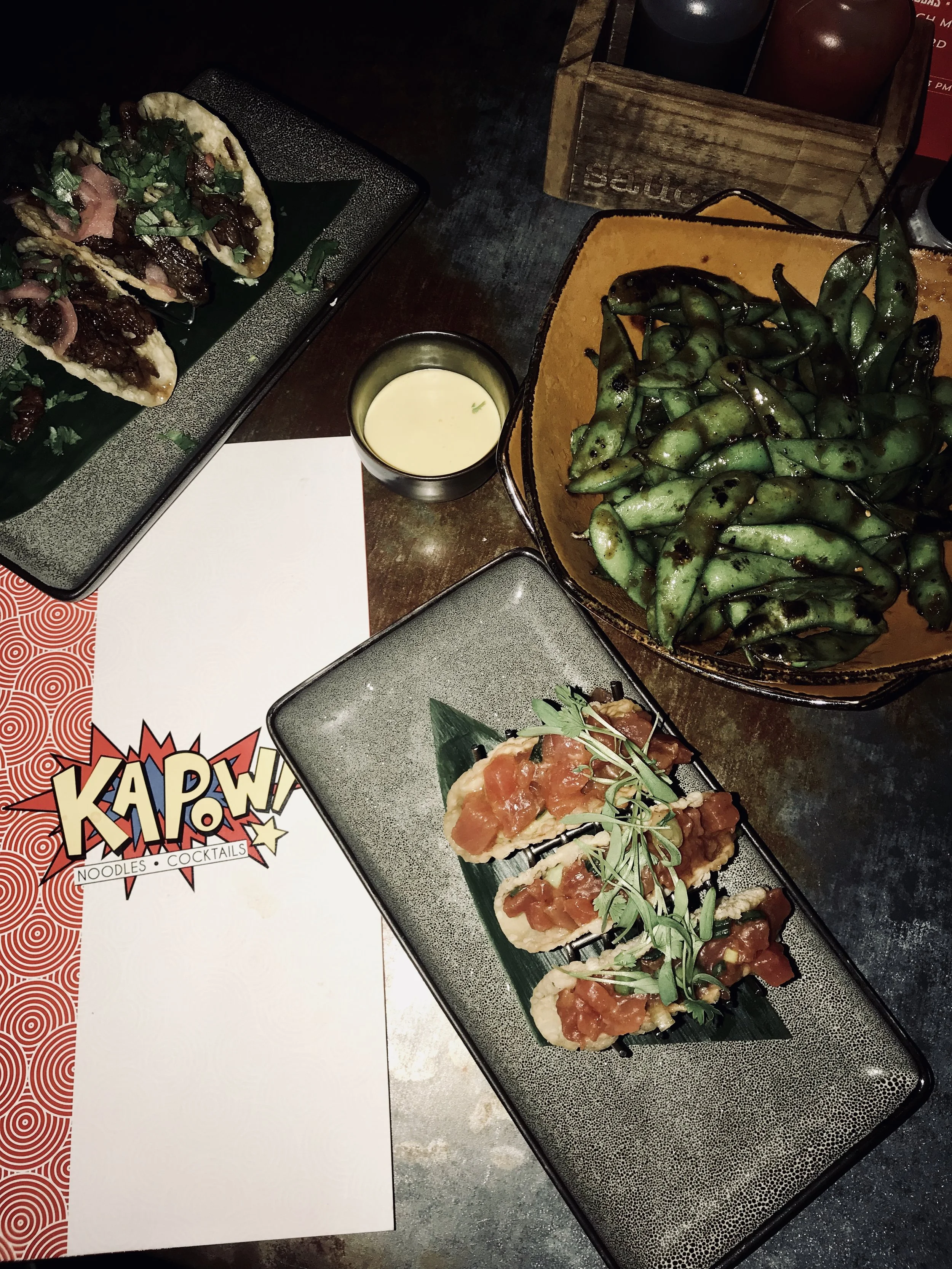 Recommendations: Wok-Charred Edamame, Ahi Tuna Poke Gyoza Tacos, Kapow! Crack Fries, Thai Donuts.